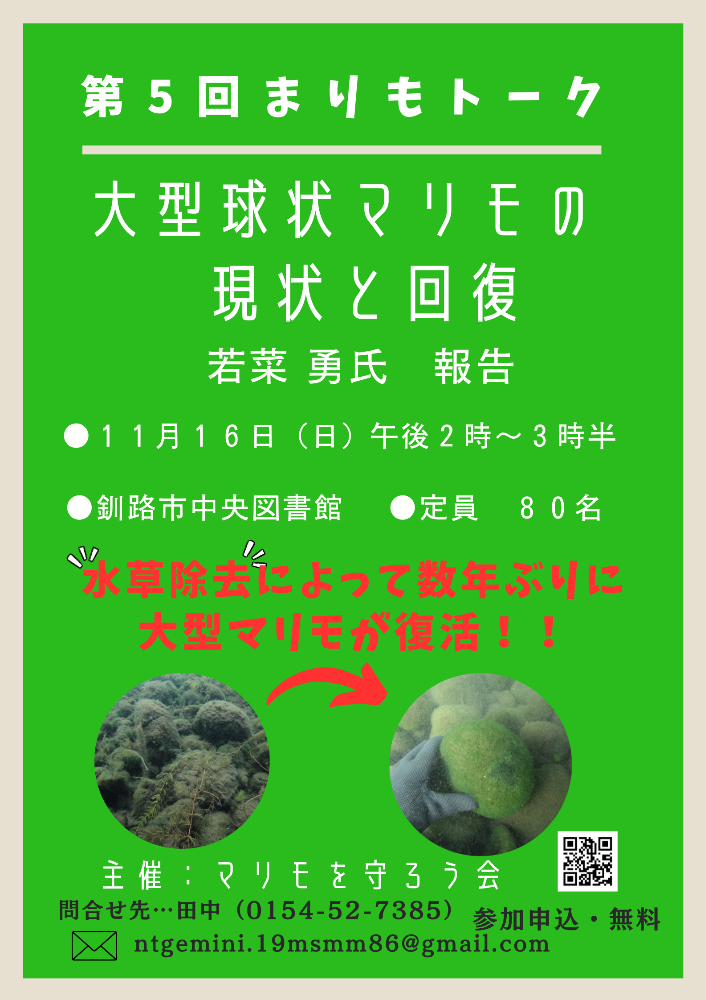 世界に誇れる”マリモ”の現状と回復について、マリモ博士、若菜勇さんのお話を聴きに行きませんか?🙇