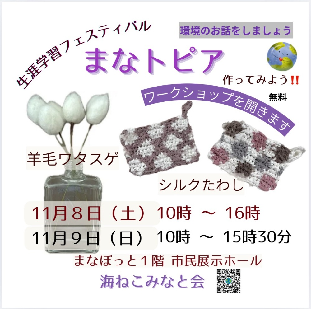 シルクたわしとワタスゲ作りのワークショップ(参加費無料)を、まなぼっと1階でします。遊びに来てください🙇