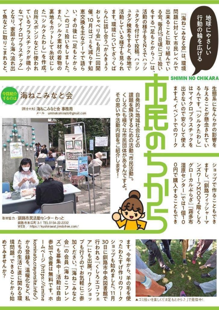 環境問題に対して市民レベルでできることをしようと2022年からスタートした会です。地球に優しい行動の輪が広がることを願って、天然素材たわしのワークショップ開催、ゴミ拾い、イベントに参加したりしています。